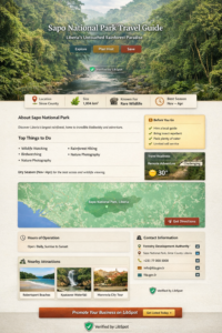 Established in 1983, Sapo National Park is Liberia’s first and largest national park, covering roughly 1,804 square kilometers of dense tropical rainforest. The park is internationally recognized for its rich biodiversity and is considered one of the most important conservation areas in West Africa.